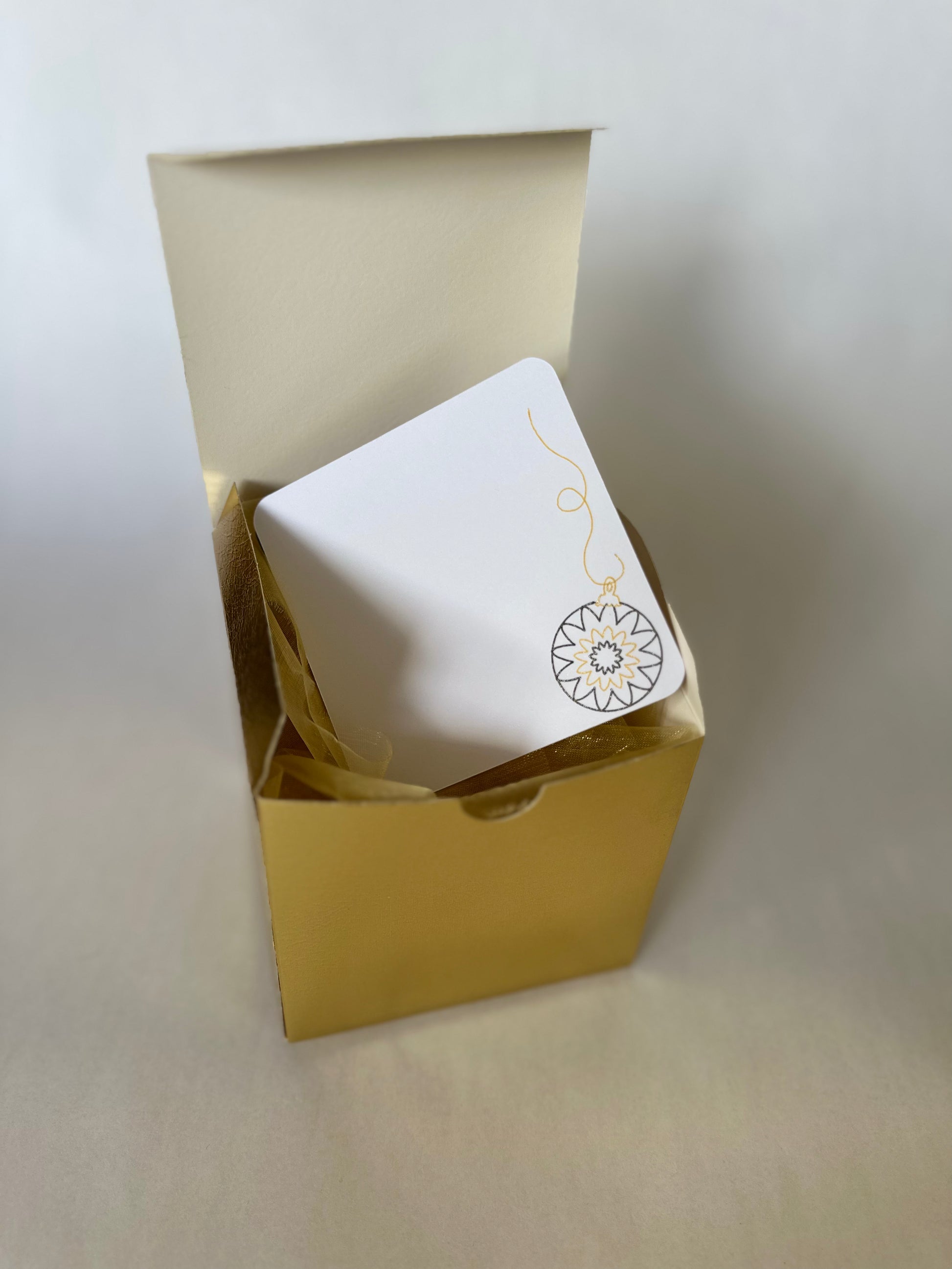 The GIY Box gives a hand-wrapped feel to a universally-loved gift. And should you like to include a short handwritten note, a Gold October signature Giftsplanation note card is included. Jot a quick, "For your morning coffee fix," or "Enjoy dinner on us over Christmas Break- you deserve it!" and sign all your names. Tape it to the inside or slide it in with the gift card. Or don't- it's your box!